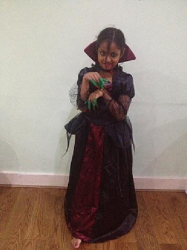 We decided to go for this costume because, the dress is Kind of similar to a witches costume with spider webs on the sleeves but it comes with a lovely( Should I say Scary Instead!?) crimson collar and black choker with red jewel to the centre. I was sure DD S would love it and and I was not wrong :). As she has a witches hatalready, we though she could wear it to school as a witch with the witch hat on and for the Halloween day she can have a different Style with the same costume but with a collar add-on. And yes, It worked perfect and it was not difficult to convince DD S and she was very impressed with the fact of having two different get ups on different days.
