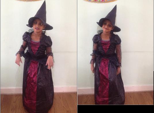 Without the Eye Makeup and other scary touch-ups, I should admit, DD S was a lovely Princess. The dress looked So Pretty on her and it is Beautifully designed” and a perfect fit. She was not really Scary 🙂 and ofcourse she was upset about it. But with the Make-up On, We had a (Good) Happy Witch ready for the show.