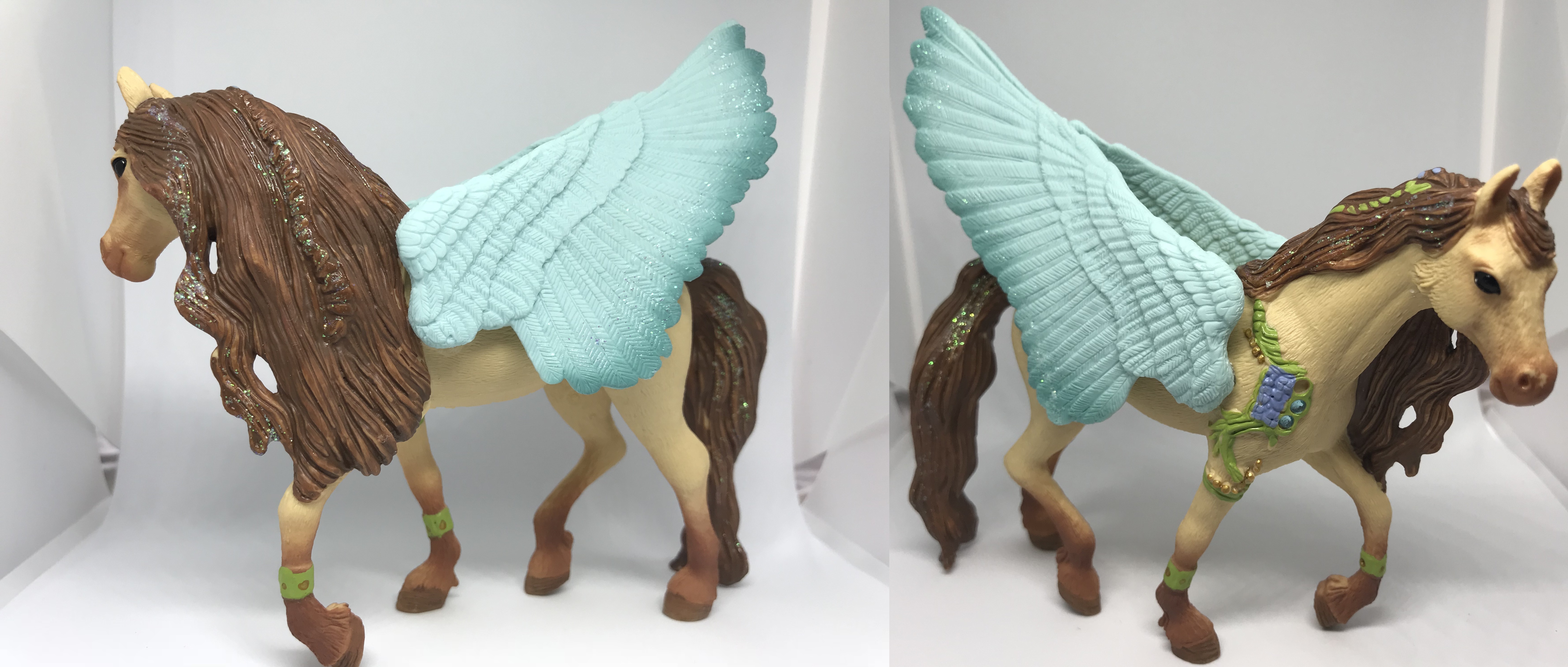 Just as Mare, the decorated Pegasus, Stallion has his own unique features and have ornaments all around his body. He has beautiful blue wings and more detailed features with glitters all around. Looks gigantic, he is definitely something to adore!